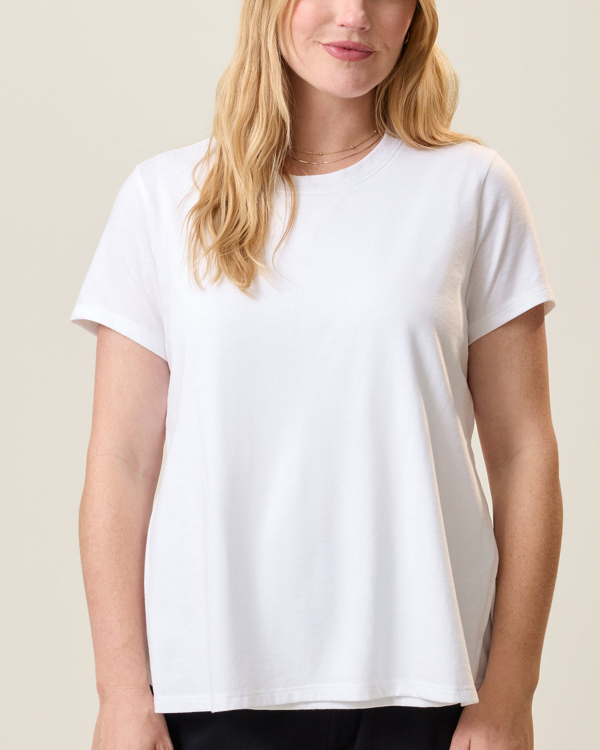 • Front view of model wearing Slim Fit Modal Nursing T-shirt in White on a neutral background@model_info:Linda is wearing a Small.